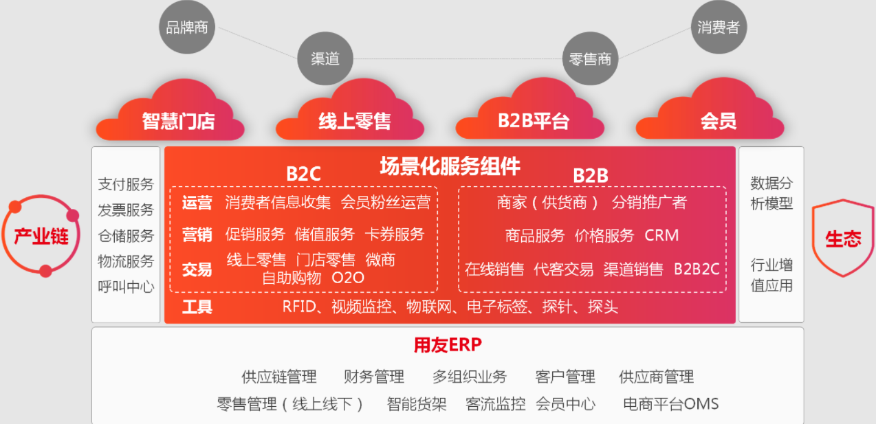 全新U8+數(shù)字營銷平臺將線上與線下業(yè)務(wù)融為一體,為企業(yè)建立前中后臺一體化的數(shù)字營銷平臺。為客戶和消費者提供友好的購物體驗、靈活的前臺服務(wù),用強大的營銷中臺支撐前端業(yè)務(wù)快速創(chuàng)新、實現(xiàn)全渠道營銷資源共享、多樣的場景化服務(wù)業(yè)務(wù),同時提供后臺業(yè)務(wù)財務(wù)一體化管理。