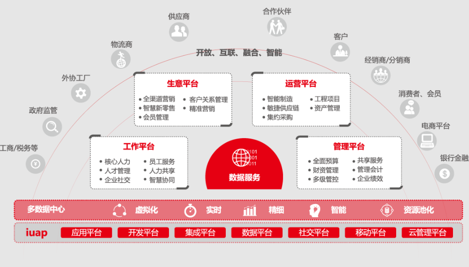 用友NC Cloud大型企業(yè)數(shù)字化平臺,深度應用新一代數(shù)字智能技術(shù),完全基于云原生架構(gòu),打造開放、互聯(lián)、融合、智能的一體化云平臺,聚焦數(shù)智化管理、數(shù)智化經(jīng)營、數(shù)智化商業(yè)等三大企業(yè)數(shù)智化轉(zhuǎn)型戰(zhàn)略方向,提供涵蓋數(shù)字營銷、財務共享、全球司庫、智能制造、敏捷供應鏈、人才管理、智慧協(xié)同等18大解決方案,幫助大型企業(yè)全面落地數(shù)智化。