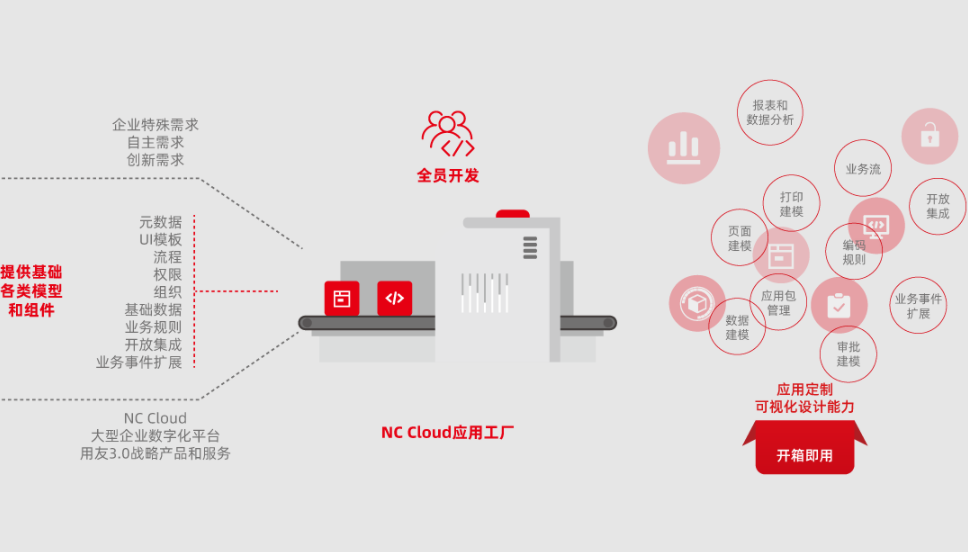 用友NC Cloud應用工廠作為零代碼開發(fā)平臺,為企業(yè)提供了各類基礎模型和組件(如元數(shù)據(jù)、UI模板、流程、權(quán)限、組織、基礎數(shù)據(jù)、業(yè)務規(guī)則、開放集成、業(yè)務事件擴展等),支持全員開發(fā),真正開箱即用,基于個性化定制開發(fā)的模式,滿足企業(yè)在數(shù)智化時代的自主創(chuàng)新需求。