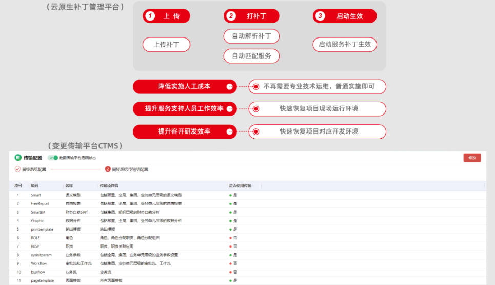 用友NC Cloud提供了可助力企業(yè)在云模式下高效運維的B類工具,通過變更傳輸平臺CTMS、云原生補丁管理平臺,保證業(yè)務系統(tǒng)的連續(xù)、可靠、一致性,同時縮短項目工期,提升實施、服務、客開等支持人員的交付效率 。